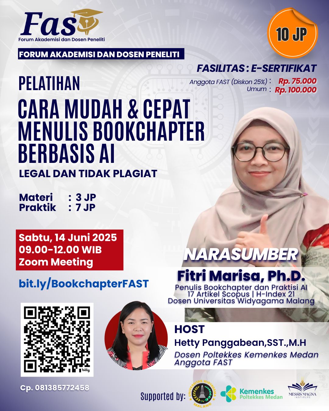 Acara ini dipandu oleh Hetty Panggabean, SST., M.H., dosen Poltekkes Kemenkes Medan yang juga merupakan anggota aktif FAST. Seluruh peserta mendapatkan e-sertifikat resmi dan akses materi pelatihan, sekaligus berkesempatan menjadi bagian dari komunitas akademik produktif di bawah naungan FAST.