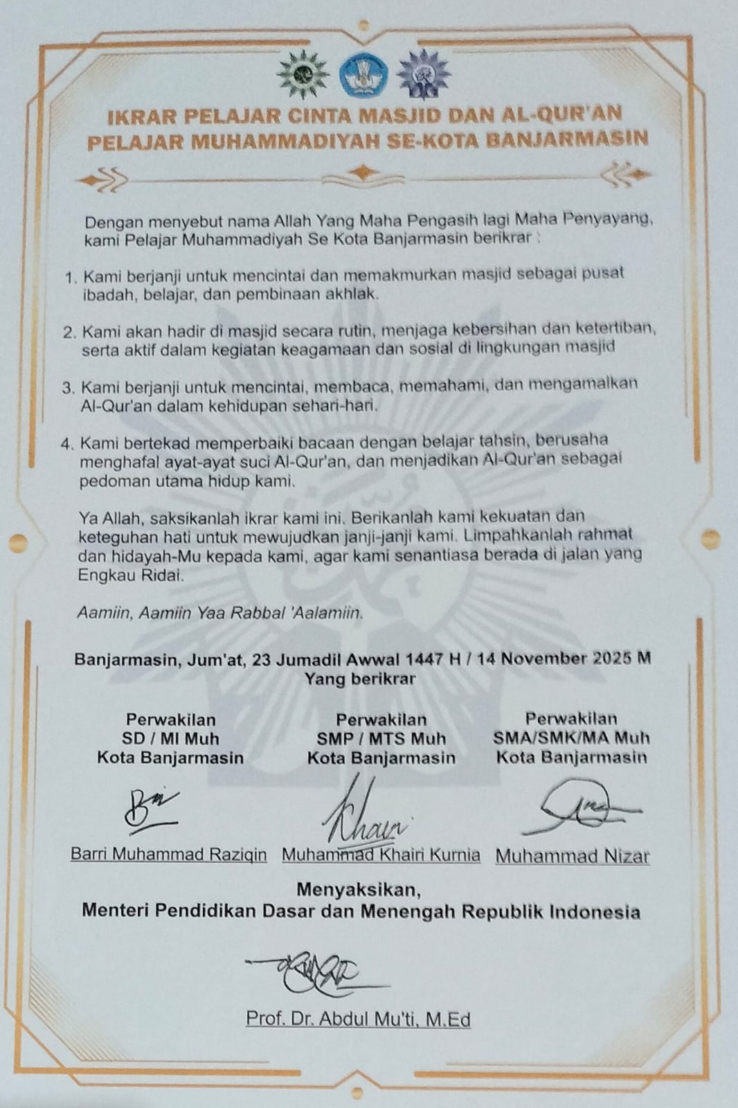 Deklarasi yang dilakukan oleh pelajar ini disaksikan dan ditandatangani langsung oleh Mendikdasmen RI Abdul Mu'ti di ruang utama masjid Al-Jihad PCM Banjarmasin 04.